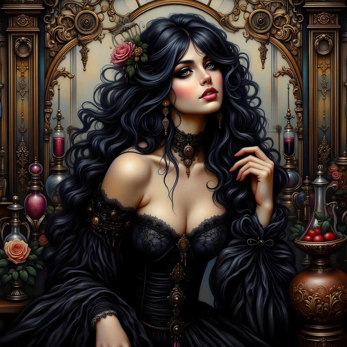 This image features a gorgeous black-haired Victorian alchemist in a romantic goth fantasy style, with décolletage, rendered as a soft natural portrait.