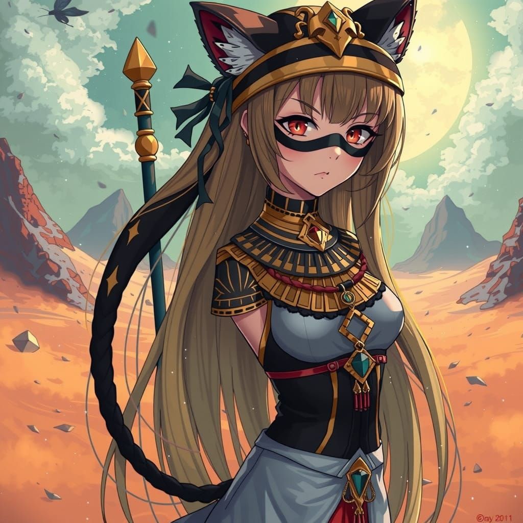 This image shows a captivating anime girl character with gold and black hair, wearing Egyptian-inspired clothing and a black eyemask, as she's controlled by a majestic purple butterfly. The artwork features bold colors and dynamic lines reminiscent of contemporary digital art styles.