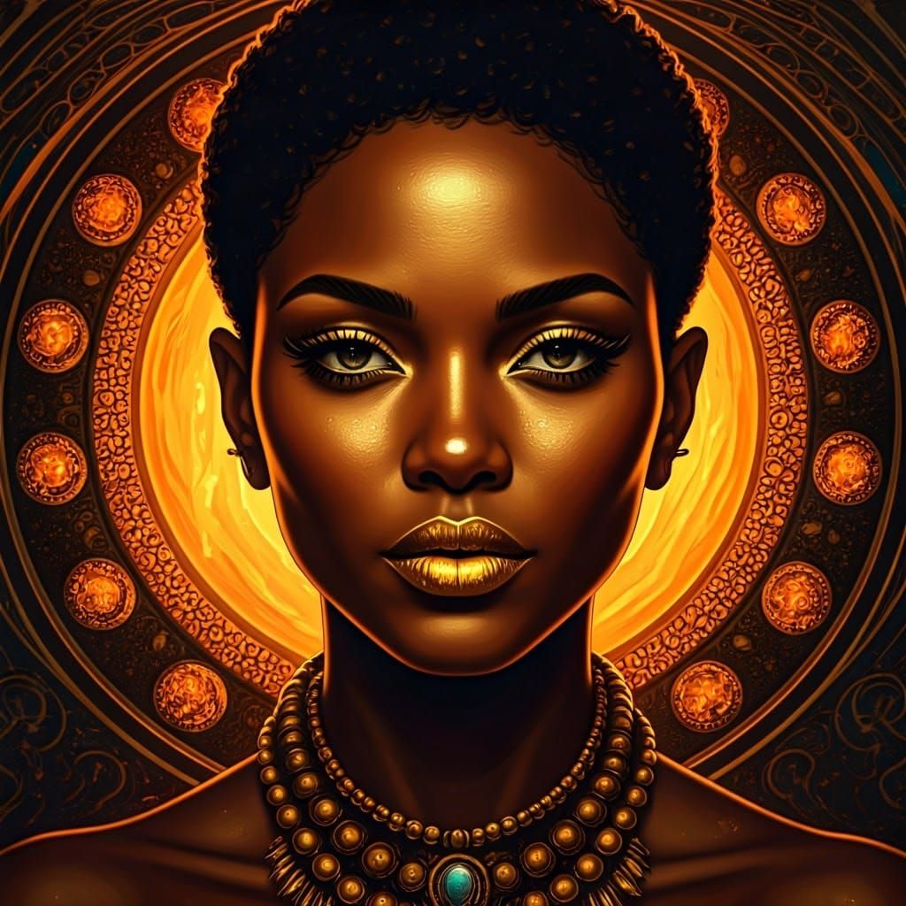 A stunning dark-skinned woman shines against a cosmic backdrop of swirling planets and galaxies, embodying alt goth chic with golden makeup and opulent jewelry, in a colorful watercolor style blending Art Nouveau flair with surreal, supernatural details.
