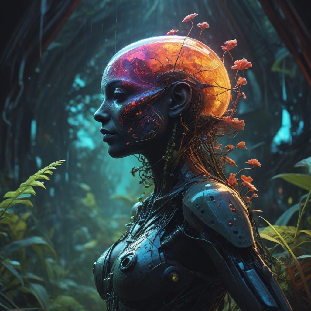 A surreal image of a mystical woman dancing on pyramids. Her body is covered in tribal patterns and seeds, surrounded by cracked mirrors, swirling particles, and micro plants in rich, glowing colors, as bio-art collage.