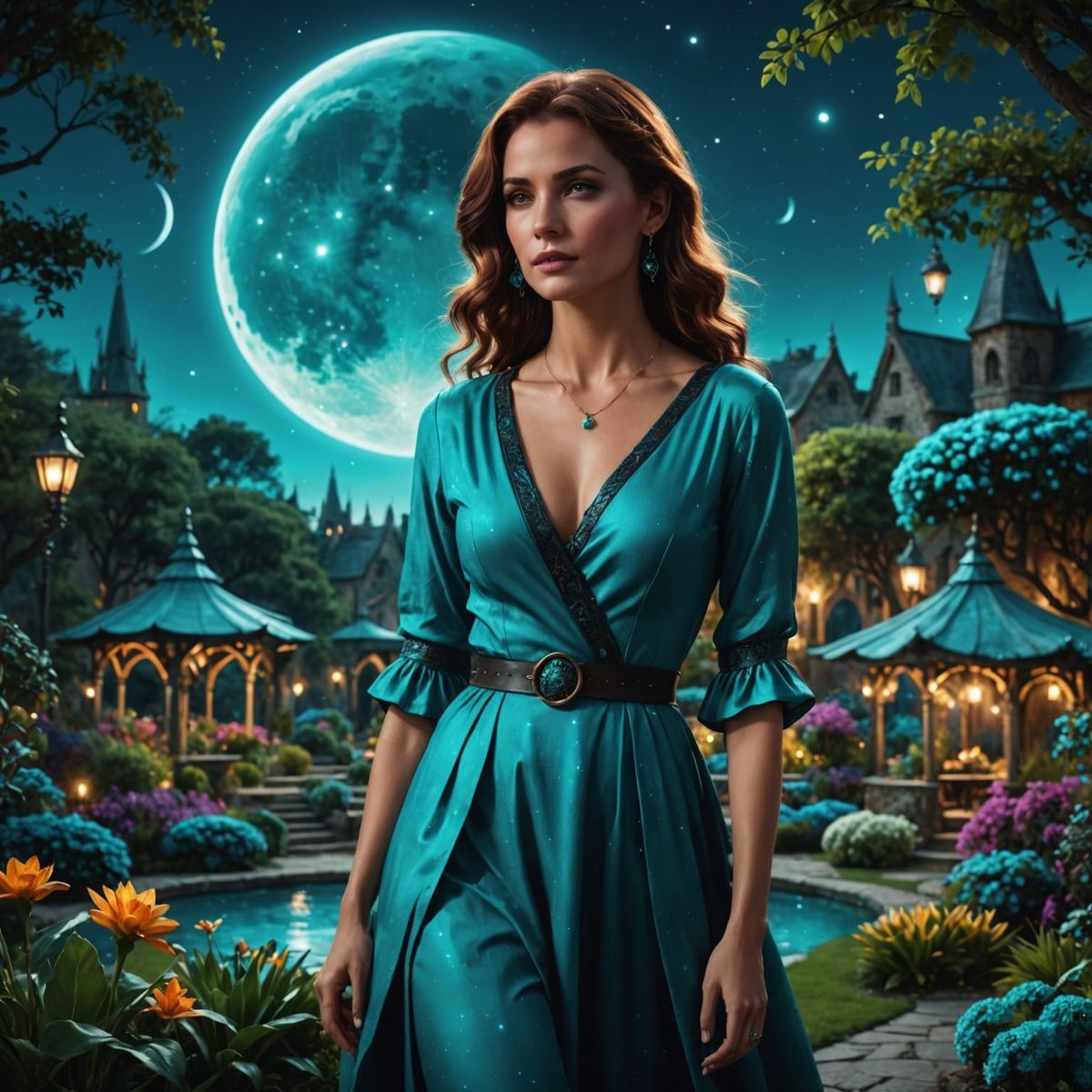 A mystical woman glows in the soft light of a moonlit garden, surrounded by the vibrant colors of a turquoise night sky, in a detailed and enchanting fantasy concept art piece.