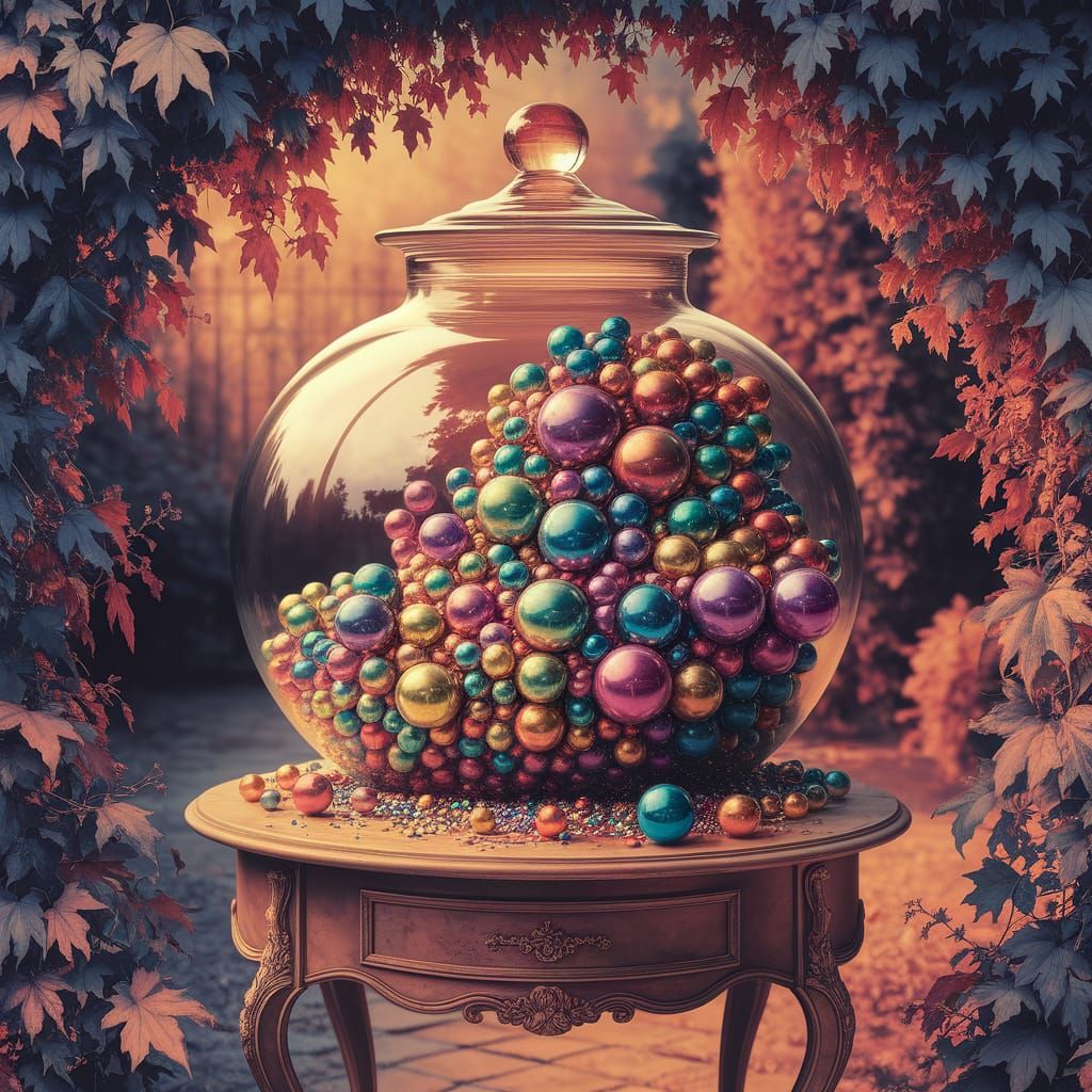 A striking picture of a huge jar filled with colorful marbles of different sizes. The illustration style is reminiscent of art nouveau, with exceptional detail and a dreamlike quality.