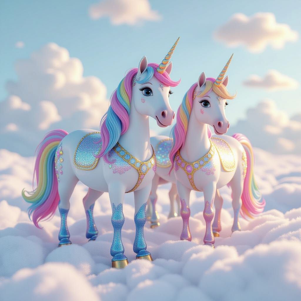 A fantastical image of rainbow-colored ponies with metallic coats against a fluffy white cloud backdrop. This vibrant digital art is rendered in a detailed, 3D style.