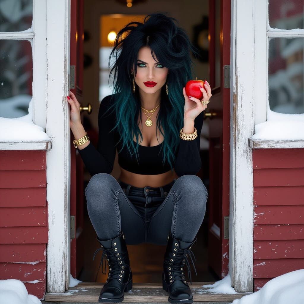 This image shows a strikingly beautiful Montenegrin woman in a doorway. The cinematic composition features contrasting elements of warmth and cold, highlighting her intense gaze and inviting smirk.