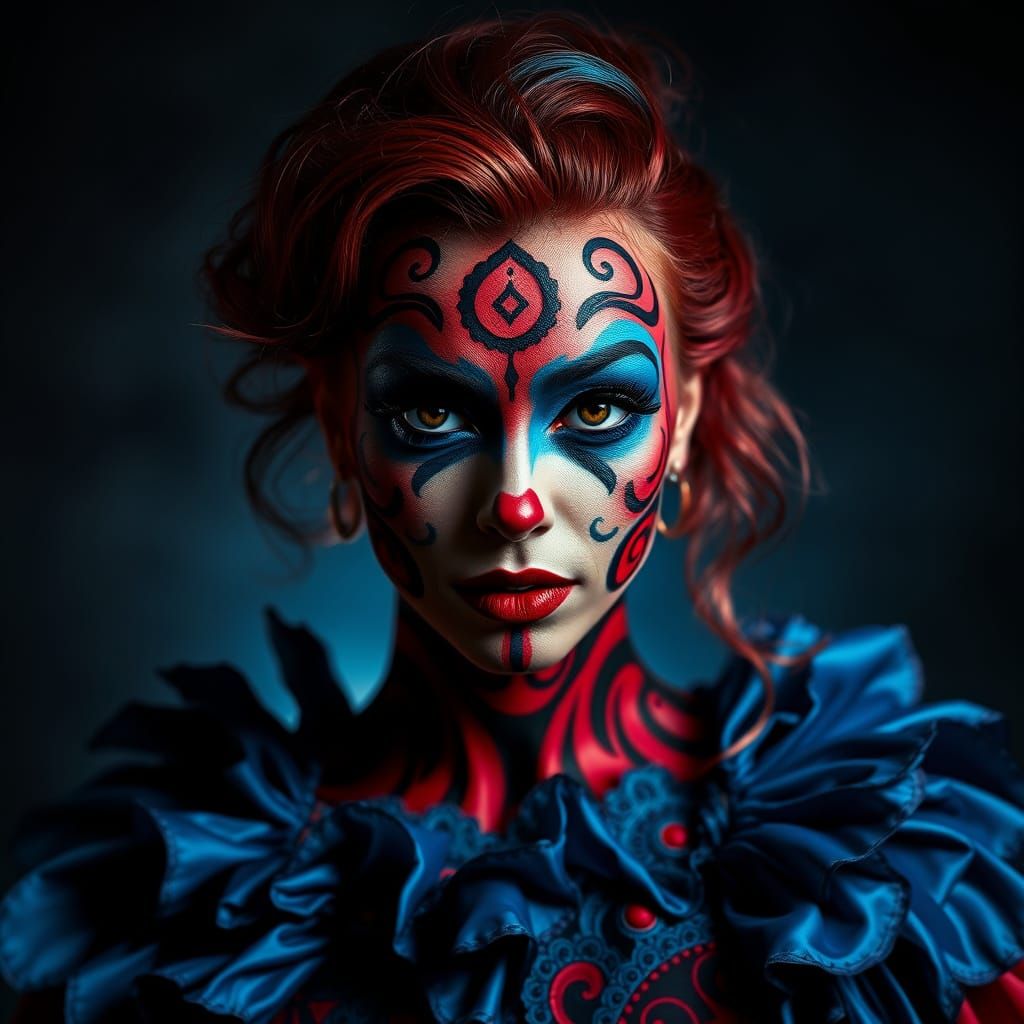 This image shows a mesmerizing circus performer with intricate face paint, bold red and blue swirls, and dramatic red lips, set against a backdrop of high-contrast lighting with a moody atmosphere, in a photorealistic style