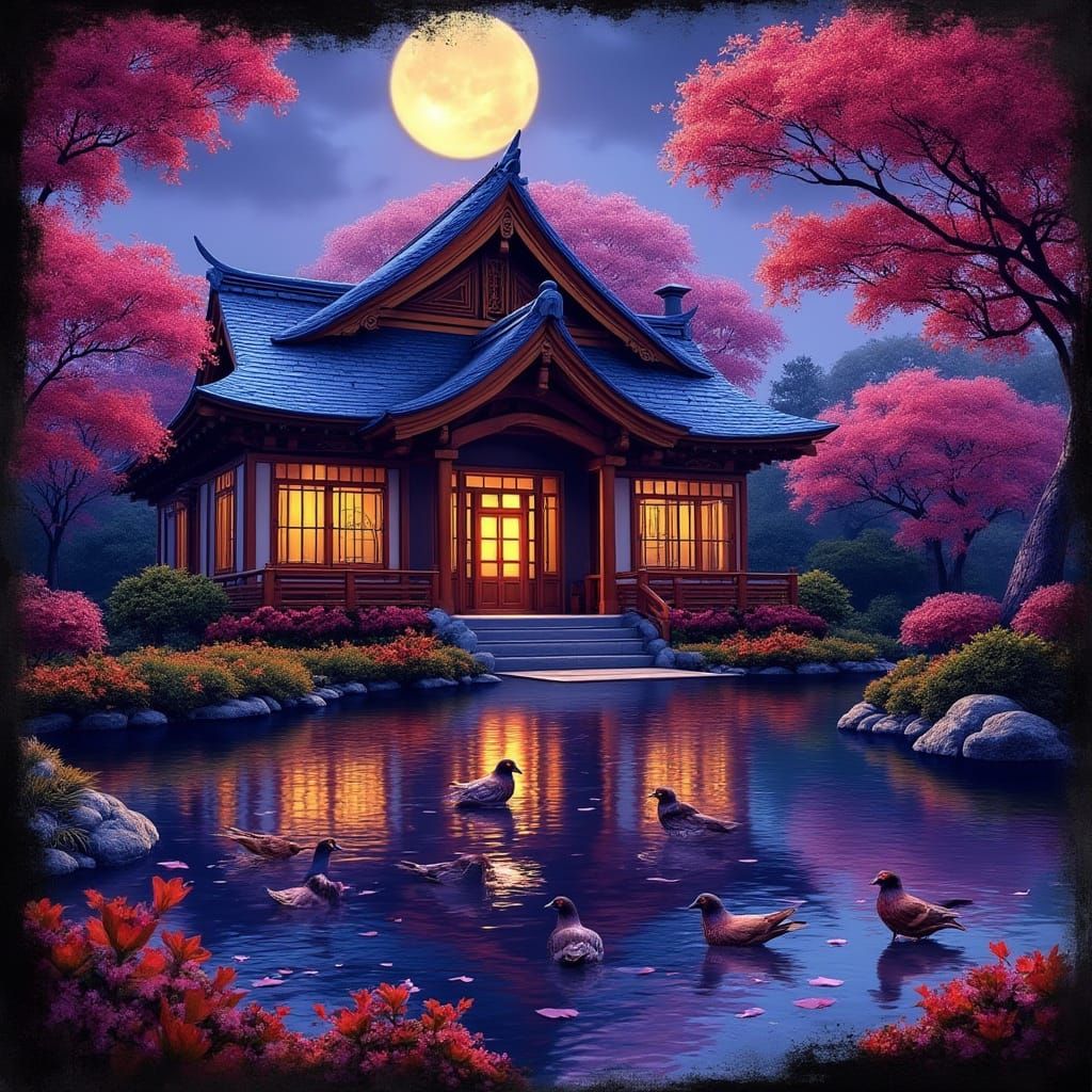 This image shows a group of Jackdaws gathered in a pond in front of a traditional Japanese cabin, set against a dark autumn backdrop with a beautifully manicured garden and a cherry blossom tree. The artwork features a hyper-realistic, ethereal atmosphere reminiscent of Australian Oil Paintings.