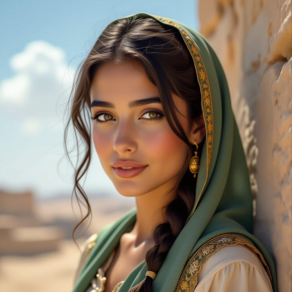 This image shows a photorealistic portrait of a 20-year-old Hebrew woman in traditional clothing from 1713 BCE. The portrait is rendered with hyperrealism and intricate detail against a clear sky.