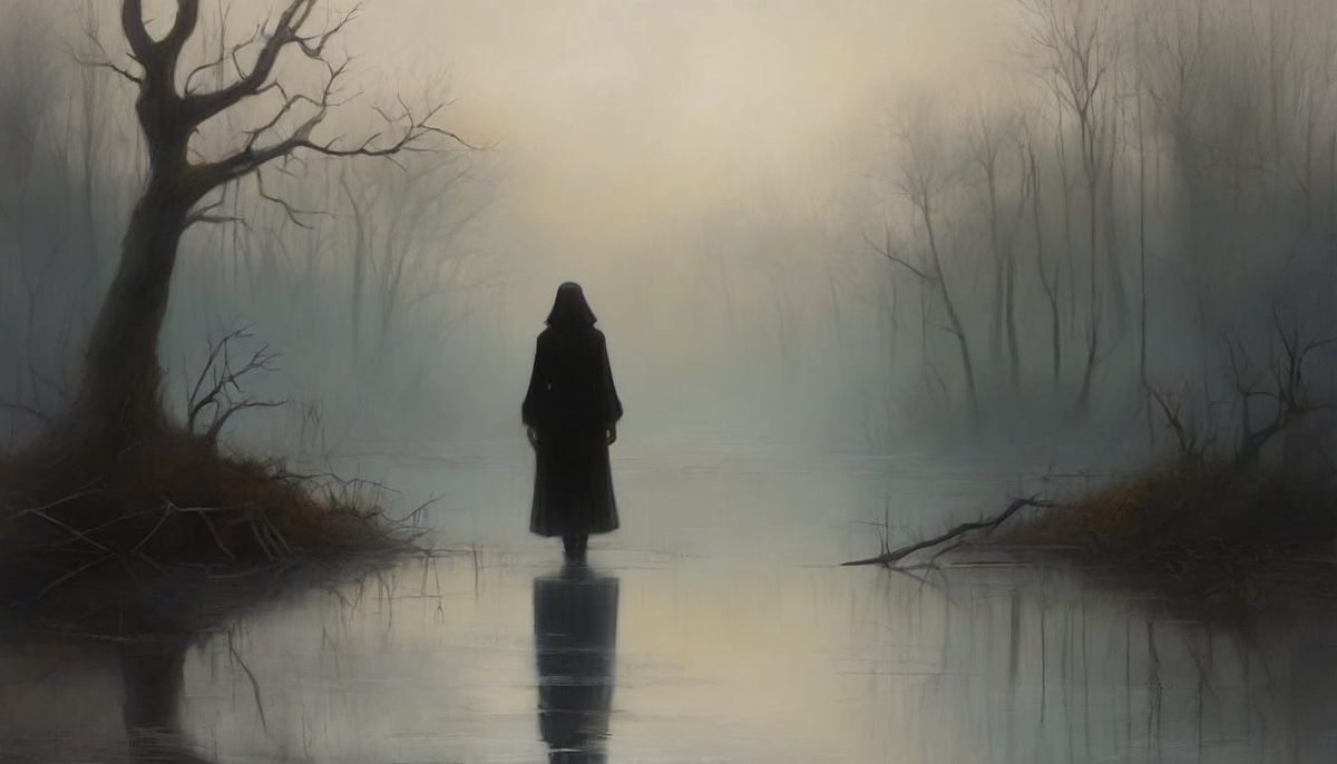 A haunting image of a misty swamp with a solitary woman in black. The scene evokes a surreal, feverish dream, rendered in muted tones reminiscent of Romanticism.