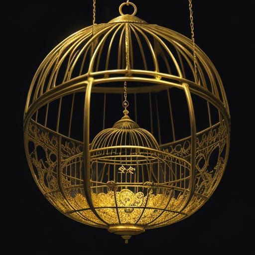 This image depicts a surreal, ornate birdcage hanging in an empty, dreamlike space. Gleaming brass bars form impossible shapes, hinting at a mysterious, solitary escape under soft twilight lighting.
