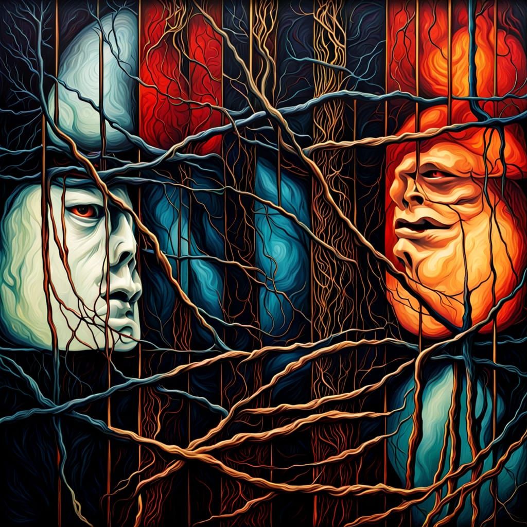 Surrealism. Close up. A face with evident veins hovers on a dark background. Oil painting. Eldritch horror elements. Twisted frames. Vivid colors and gradients. Dramatic lighting. Best quality. Masterpiece. Unsettling. Visceral. Hyperdetailed. Dark academia. Macabre. Baroque. Oil on black.