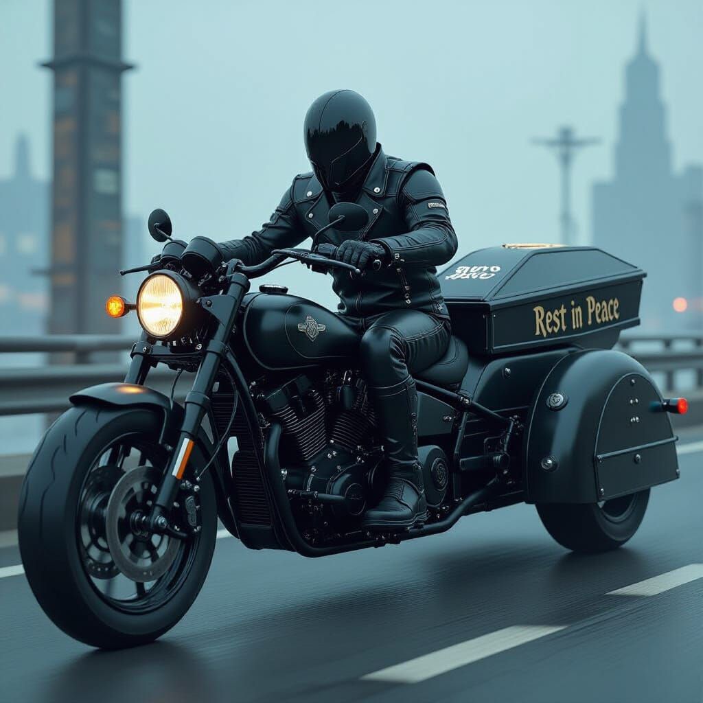 This image shows a dark metal robot in black leather riding a Vincent 1000 motorcycle with a coffin sidecar. The artwork has a dark, gritty, industrial aesthetic.