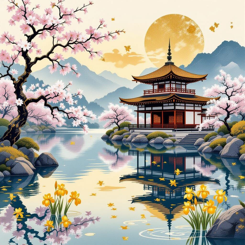 This image shows a luxurious vintage Japanese garden with an opulent tea house beside a reflective pond, featuring gold dust, Sakura trees, and iris flowers, painted in a detailed modern ukiyo-e style.