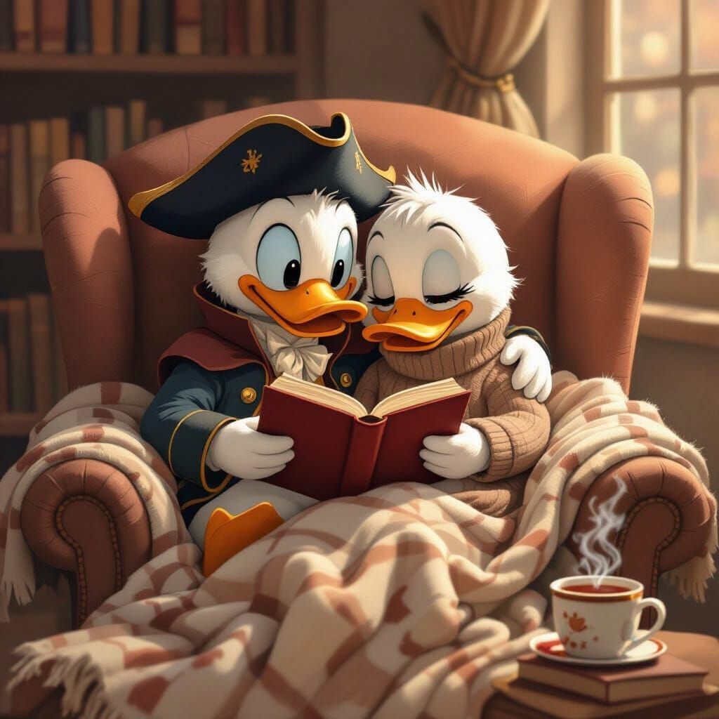This image shows two Disney-style anthropomorphic ducks reading together on an armchair. The cozy scene is bathed in warm, sepia-toned light, reminiscent of a Ghibli animation.