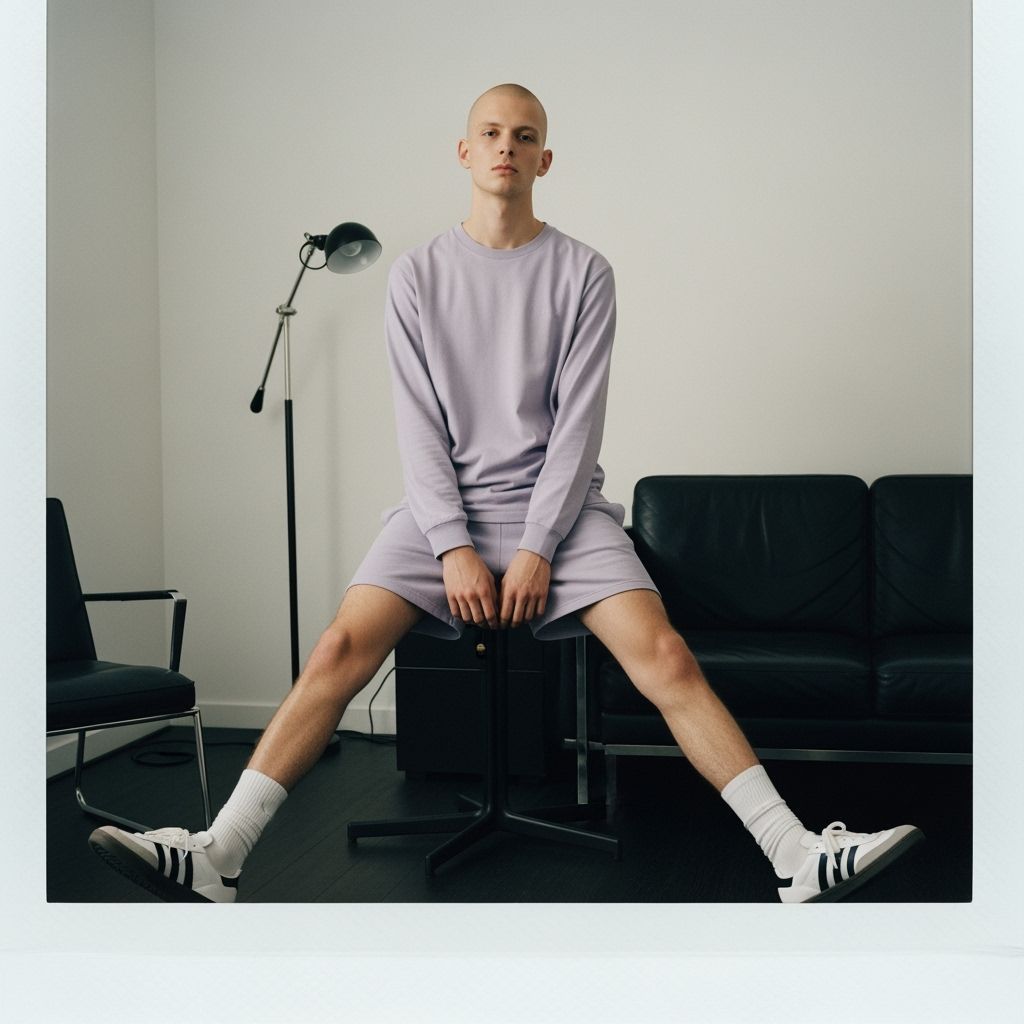 A striking picture of a slender, bald male model posing in a minimalist black leather bedroom. He's wearing a lavender outfit and leaning against a chair in a provocative pose. The image is a high-contrast Polaroid-style photograph.