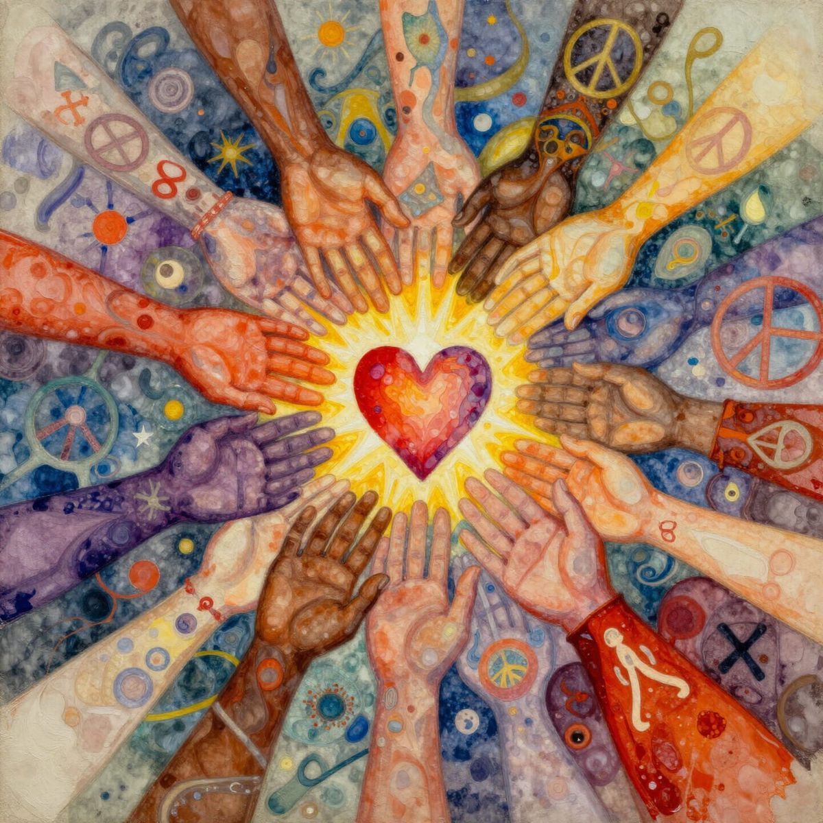 This image showcases a symbolic mixed media collage celebrating universal cooperation and compassion. It features diverse hands, peace symbols, and flowing organic shapes with vibrant colors and intricate textures, evoking a sense of interconnectedness.