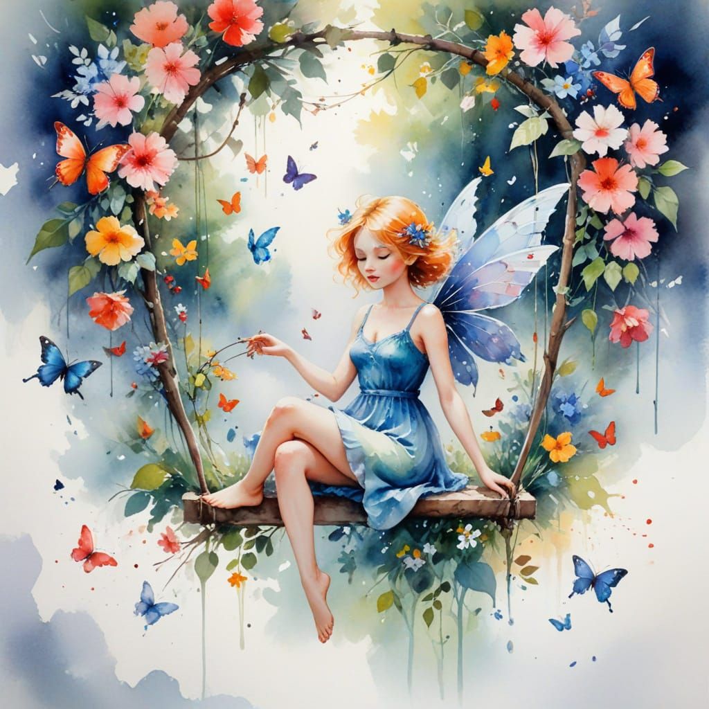 A watercolor painting of a fairy on a swing in a magical garden. The artwork blends expressive watercolor techniques with cinematic stylization to create a mesmerizing fusion of beauty.