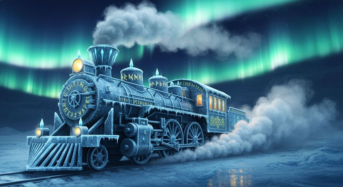 An ancient, rune-etched locomotive covered in frost travels a frozen tundra, illuminated by the Aurora Borealis. Epic fantasy concept art with dramatic lighting and immense scale.