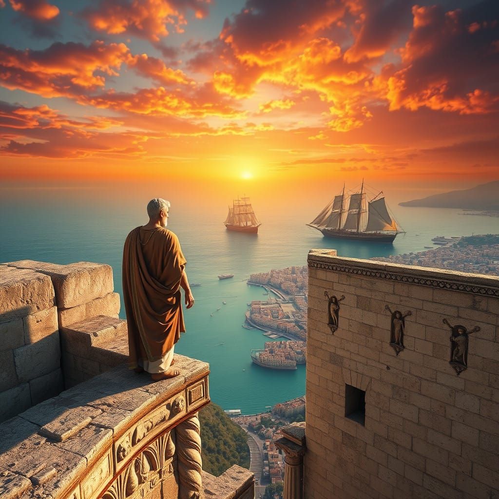 This image shows a philosopher in a simple tunic standing atop ancient stone walls, gazing out at warships on the Mediterranean Sea, with a warm sunset casting long shadows across the weathered battlements, set against a vibrant, fantastical backdrop.