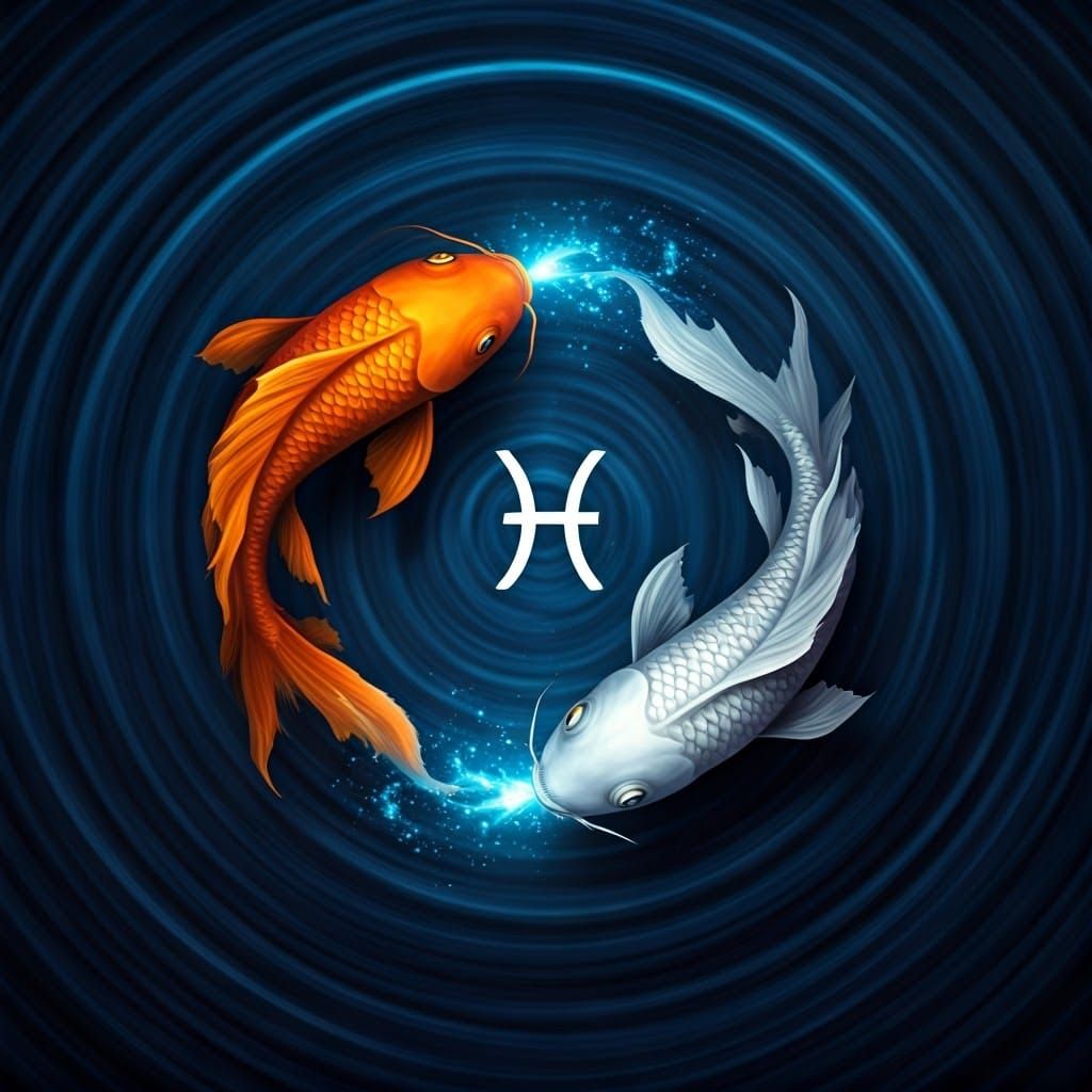 This enchanting image depicts a Pisces zodiac symbol surrounded by a mystical aquatic scene. Two majestic dragon Koi fish, one orange and one white, swim in opposite directions, connected by a sparkling aqua thread. The scene is reminiscent of fantasy concept art with intricate textures and curved lines,...