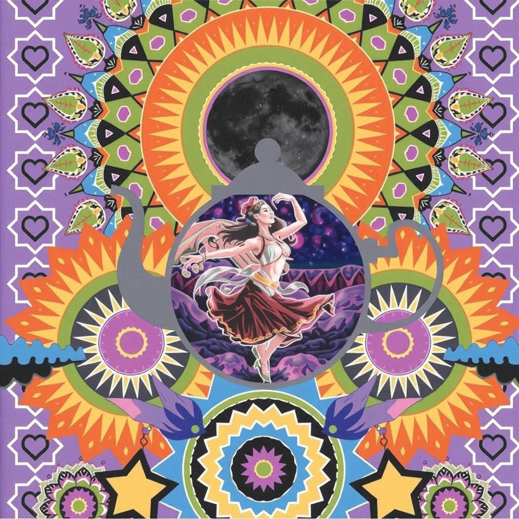 A creative logo featuring a teapot, belly dancer, and desert landscape in a striking triple exposure, set against a night sky with intricate details.