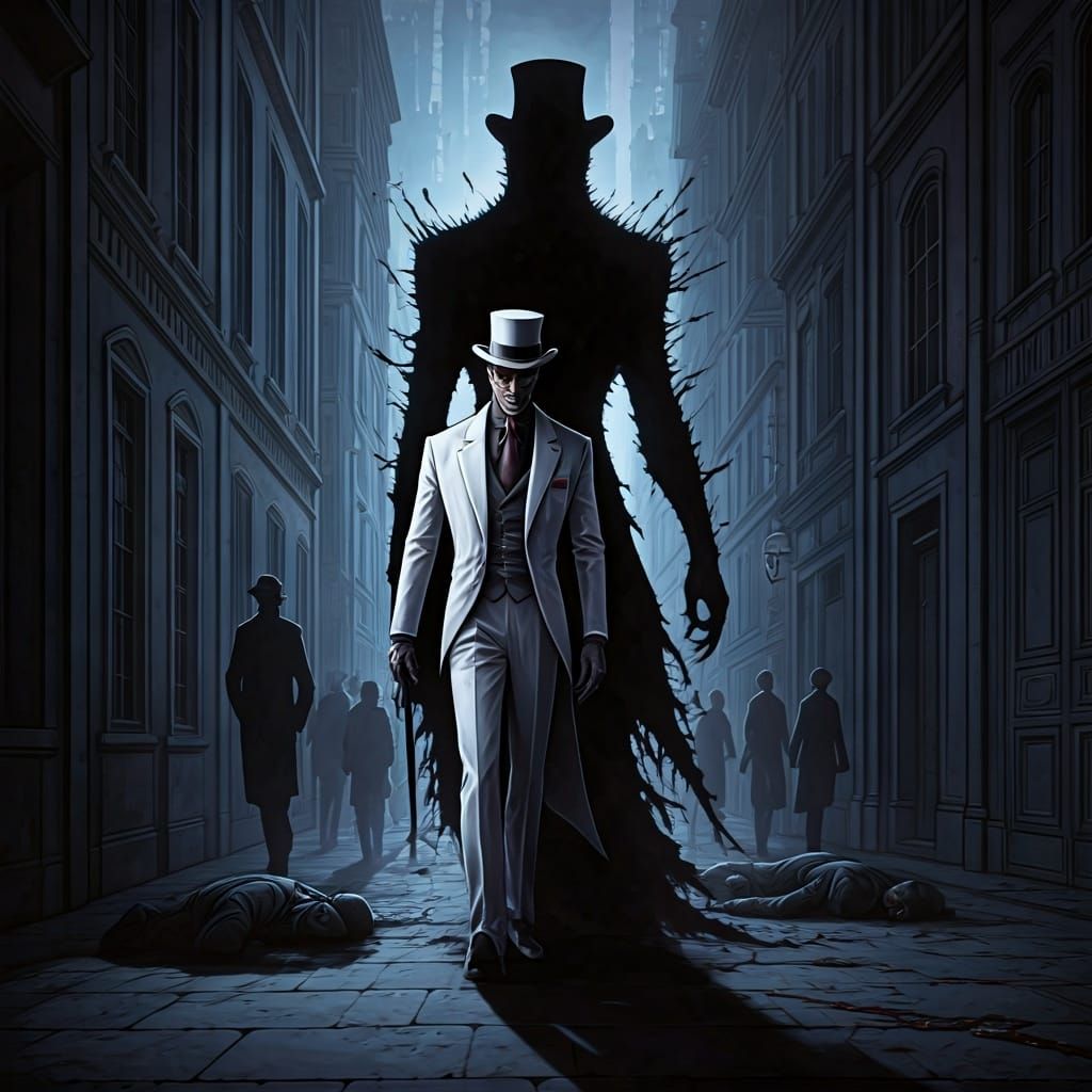 A villain in a white suit walks down a crowded street as his shadow feeds on people's energy. The image blends dreamy landscapes with gouache painting and hyperdetailed charcoal accents.