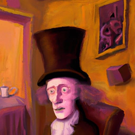 This image shows a maniacal Mad Hatter in a haunted brown room, rendered in a style reminiscent of Francis Bacon's intense and distorted figures.