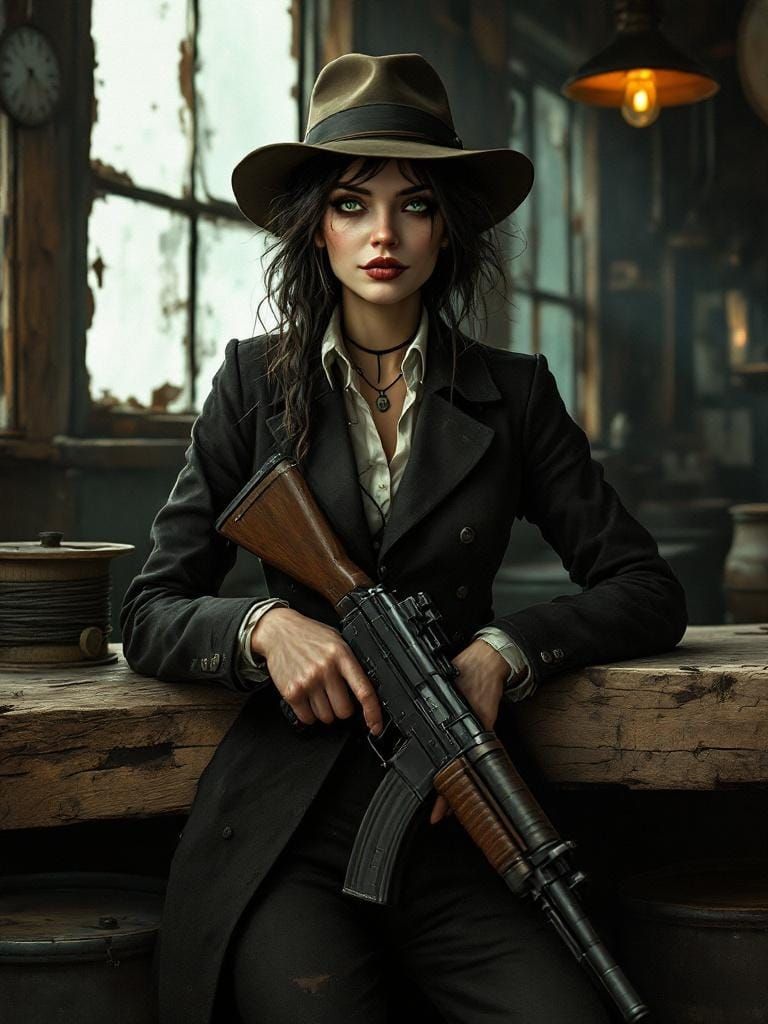 This image shows a hard-faced woman in a worn suit holding a submachine gun in a post-apocalyptic saloon. Light filters through dirty windows, illuminating the gritty textures and deep colors in a dramatic perspective.