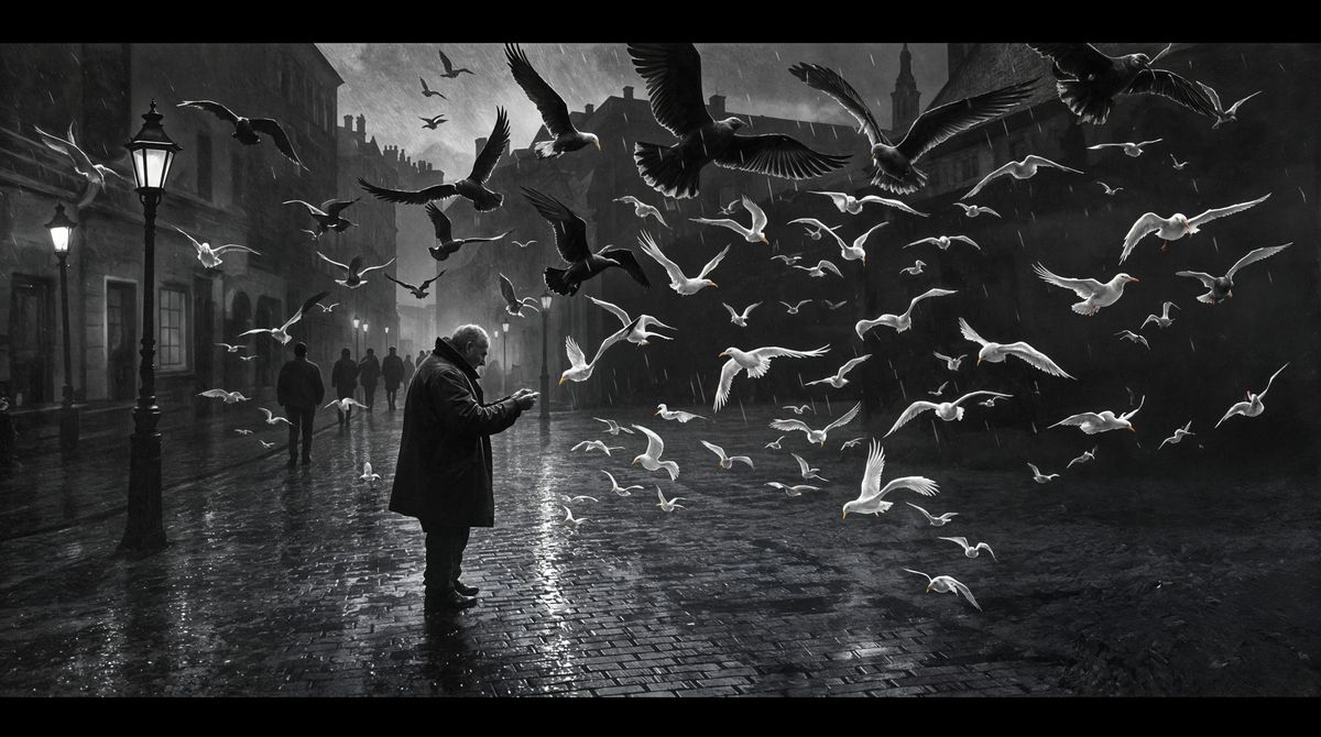 This haunting image shows a fisherman surrounded by seagulls in a dimly lit old town square, their shadows transforming into eerie silhouettes of mythical sea creatures. Created in a moody Dark Romanticism style with smooth transitions between light and shadow.