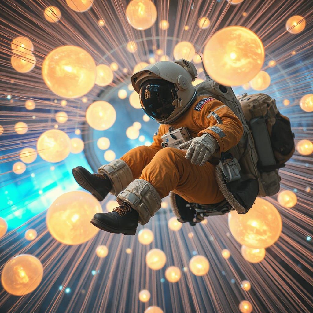 A astronaut floats through a intricately arranged, magnificent strings and globes of light, mathematical formulas of precise beauty, Fibonacci sequence, convey perfection through meticulous composition, shot in exquisite high-resolution detail, akin to an LSST camera's razor-sharp gaze, channeling the ...
