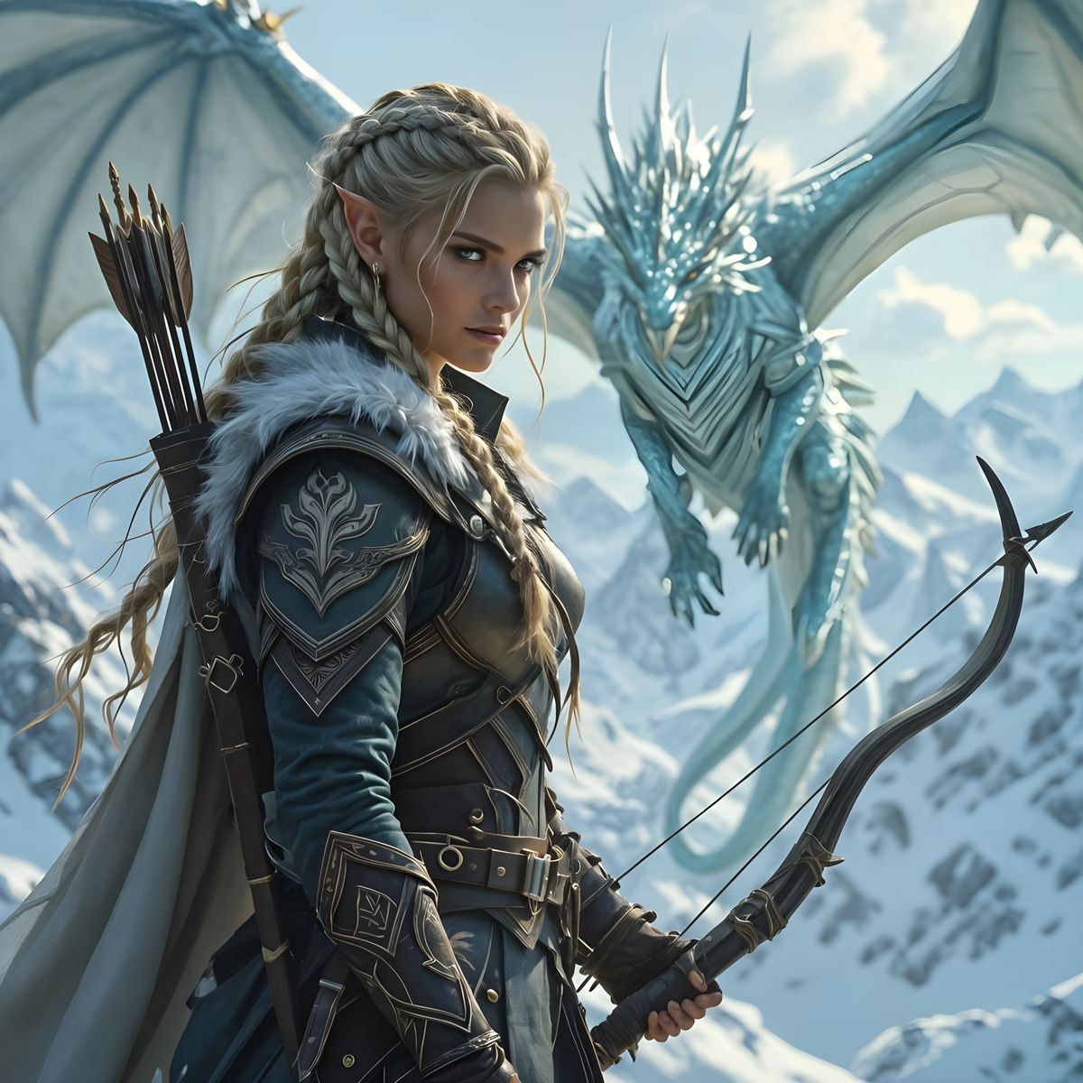A striking picture of an elf warrior standing on a snowy mountain. A dragon flies above her as she aims her bow. The image is rendered with dramatic lighting and an ethereal color palette.