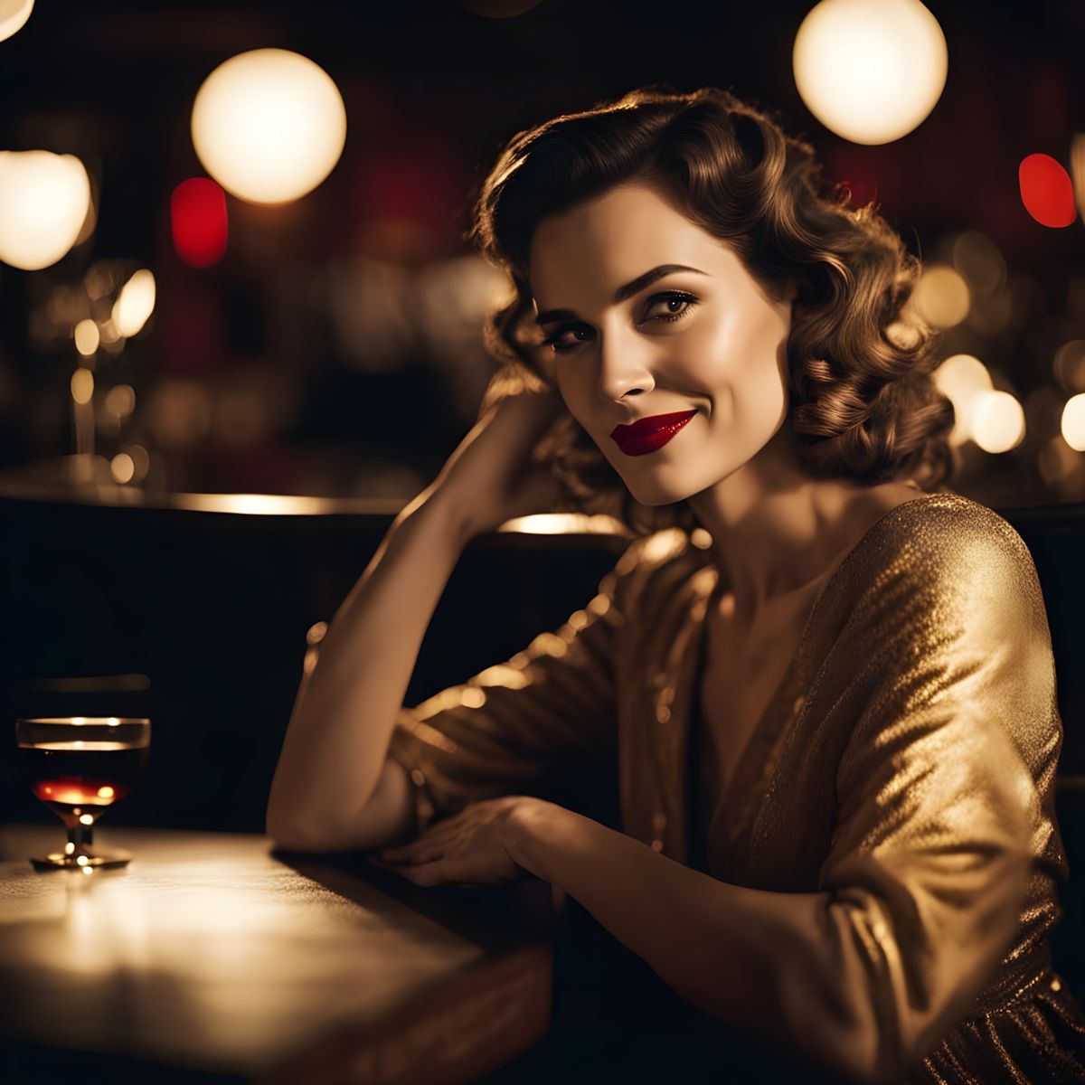 A realistic image of a curvy woman in her late 30s sitting in a dimly lit bar, glancing towards the viewer. The scene is set with romantic lighting and an intimate atmosphere.