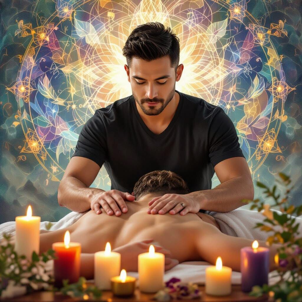 A digital painting shows a massage therapist healing a client in a candlelit room. The artwork features vibrant, ethereal colors and shamanic spiritual symbolism.