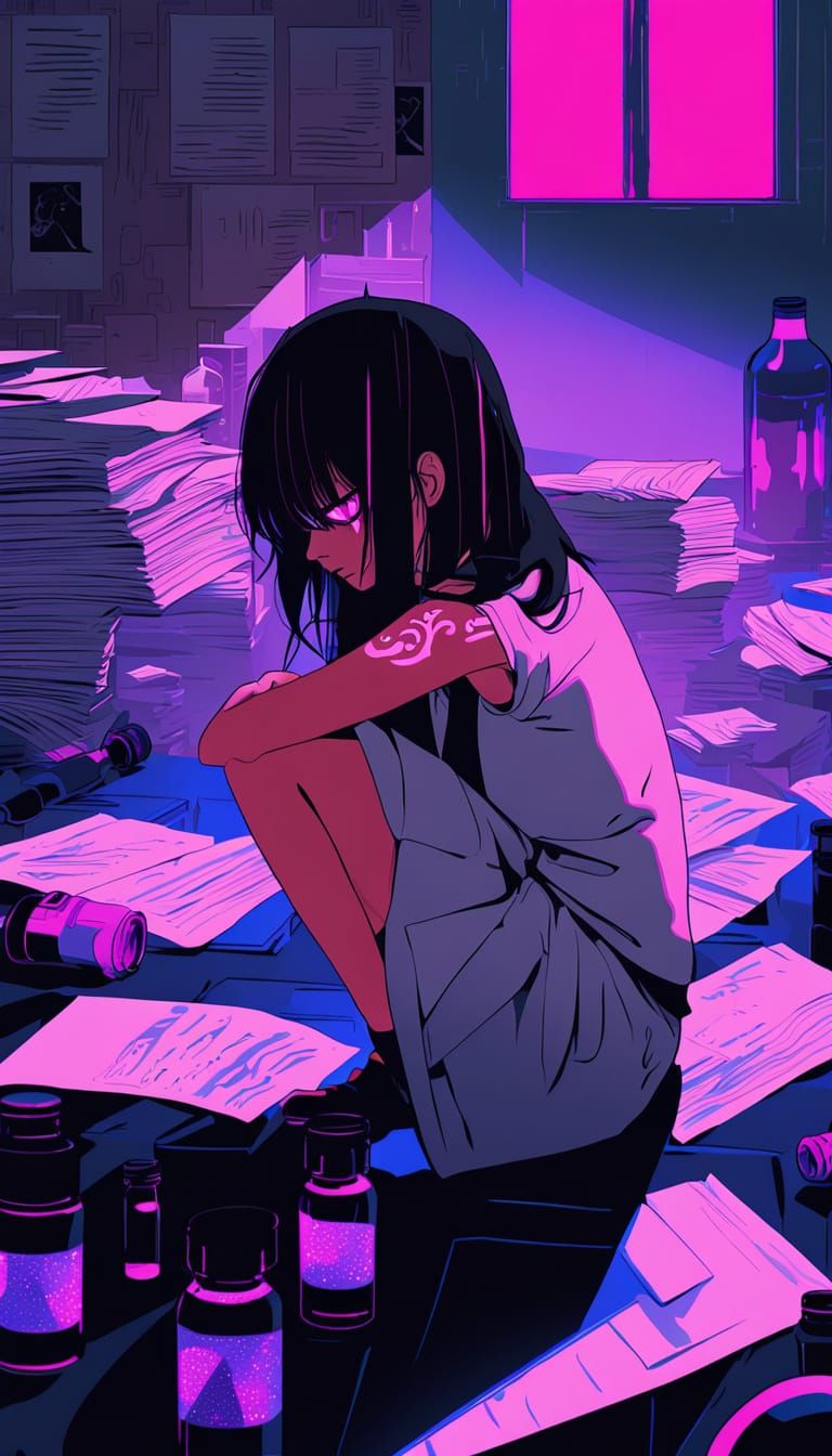 This illustration features an anime girl with edgy tattoos and black hair with neon pink streaks, sitting on the floor amidst scattered art papers and glowing bottles, bathed in neon purple and blue light.