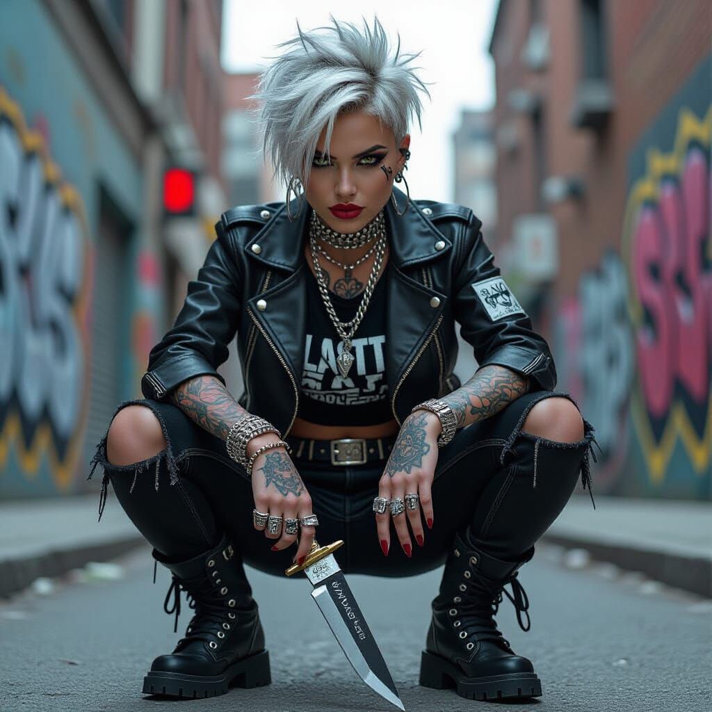 A digital illustration of a punk girl confidently squatting in a gritty urban setting. She has bold tattoos, silver and gold hair, and multiple piercings, rendered in hyper-realistic detail with dramatic lighting.