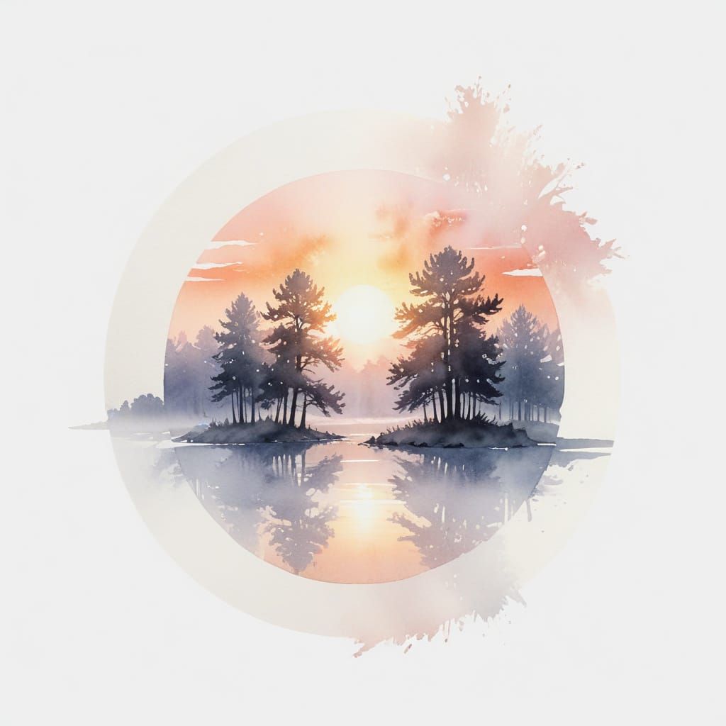 This serene watercolor painting captures a misty spring morning with silhouetted trees and a rising sun glow. The image features soft pastel hues, visible paper texture, and an unfinished edge style, evoking a sense of tranquility and atmosphere.