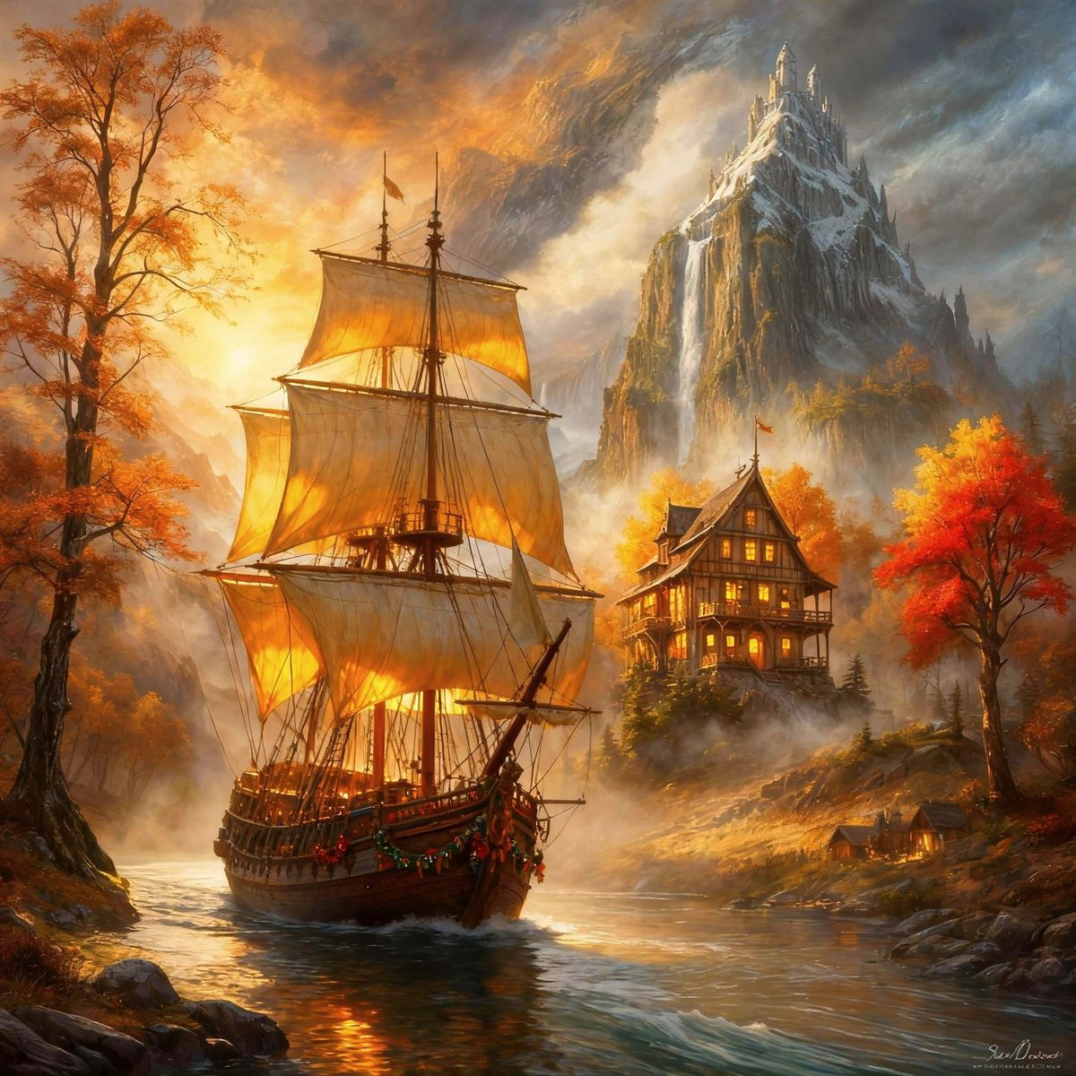 A detailed fantasy painting of a galleon sailing a river through a forest with golden leaves. Features a waterfall, castle, and snowy mountain under a glowing sky, creating a magical atmosphere.