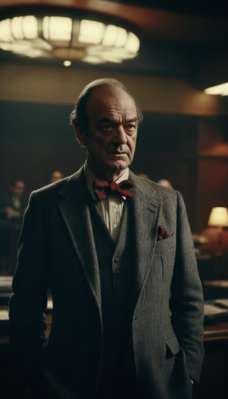 This cinematic film still captures a young 1920s journalist in a dimly lit newsroom, with warm, nostalgic lighting and deep shadows. The image features a dark gray suit and red tartan bow tie, with a subtle vignette and film grain texture.