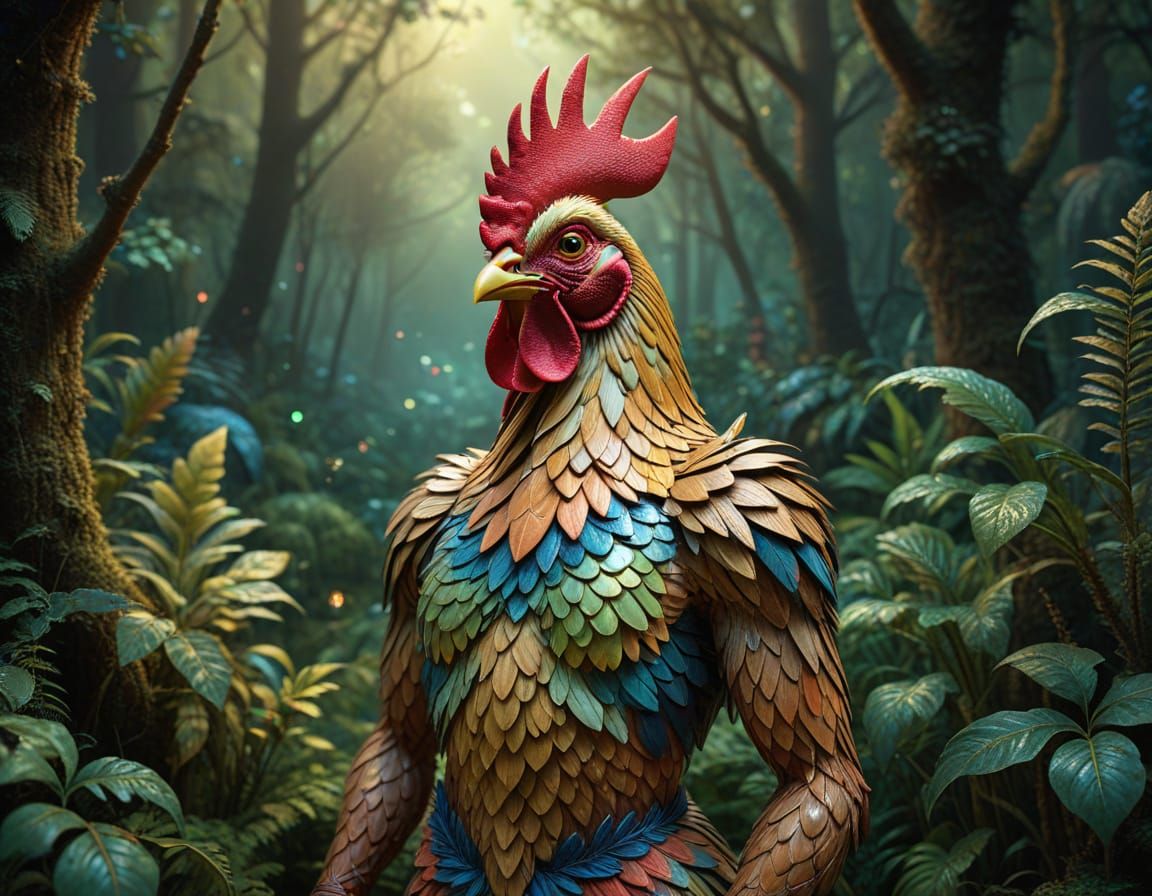 A majestic, low-poly rooster stands proudly in a mystical forest, surrounded by lush foliage and intricate textures. The image features vibrant, triadic colors and an ethereal, dreamy quality, reminiscent of visionary pop-surrealism and hyper-realistic art.