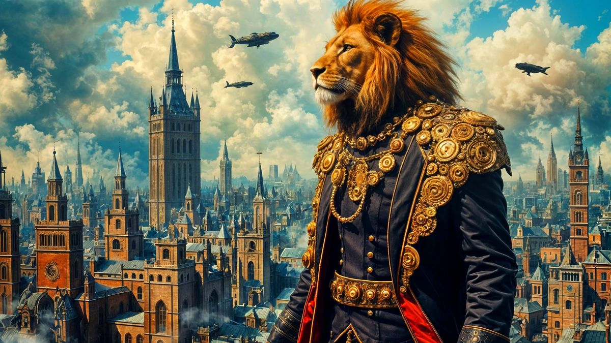 <lora:Marionette-Flux:1.0> <lora:MJ6 Dark Oil Paint:1.0> <lora:Morbid:1.0> A regal lion, clad in a finely tailored steampunk suit with intricate brass gears and cogs adorning his attire, stands proudly before a magnificent clockwork city, his gaze fixed on the horizon. The sky is filled with colossal ...
