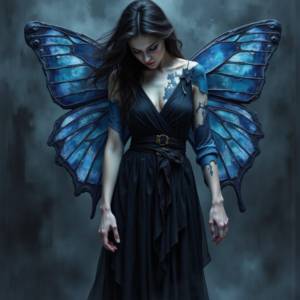 This image shows a beautiful woman composed of abstract shapes and translucent colors, with geometric butterfly wings. The artwork is rendered with extreme detail in shades of grey, black, and deep blue, conveying a sense of loneliness and depression.