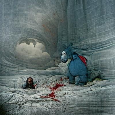 A dark and unsettling image of Eeyore enacting revenge. The image is rendered in a gothic horror style, reminiscent of woodcut engravings and dark fantasy art.