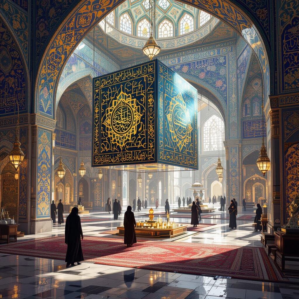 This image depicts a 30 sqm open-plan service area, inspired by the sacred cubes of Imam Reza Shrine. Rendered in a detailed matte painting style with deep, complementary colors, it features intricate fantasy concept art.