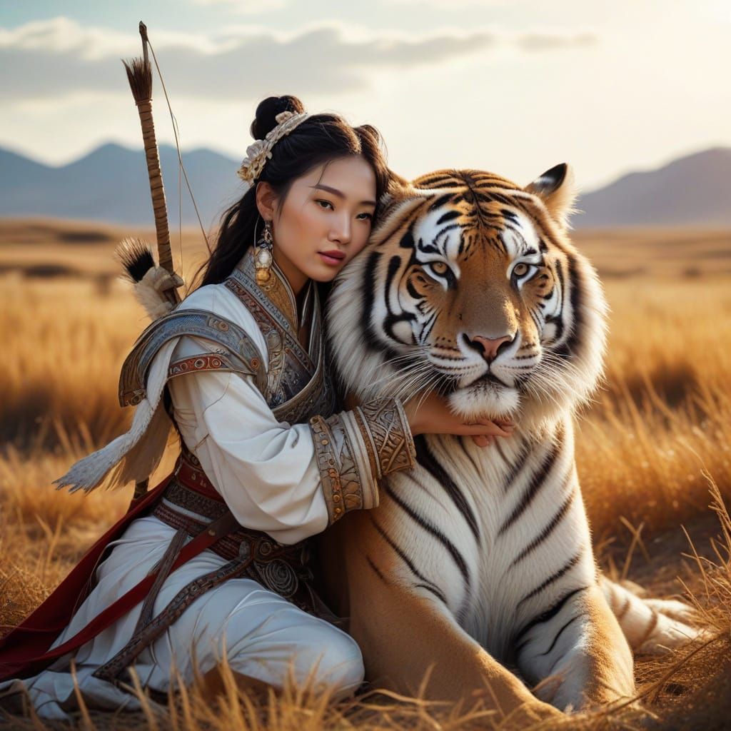 This image shows a Mongolian warrior girl with a white tiger in an origami dreamscape. Soft sunlight illuminates the cinematic and impressionistic scene, creating surreal textures in a professional portrait style.