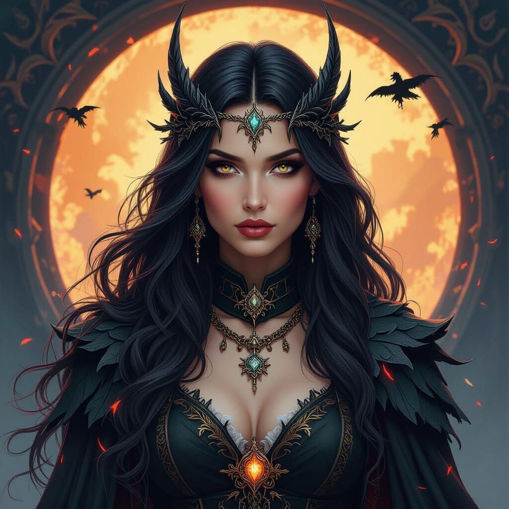This image depicts a mystical figure, a Shadow-Witch and Paranormal Investigator, rendered in a detailed fantasy concept art style with deep, complementary colors and intricate detail.