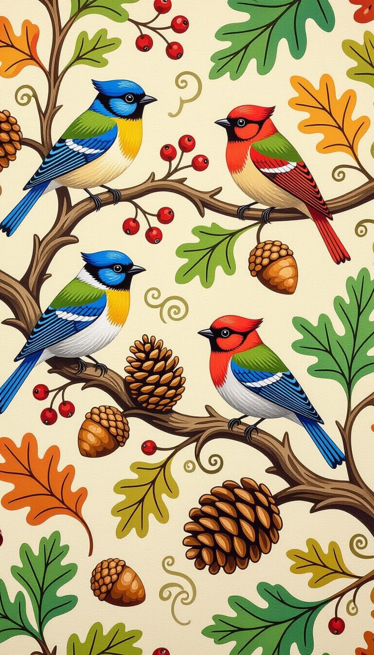 This image showcases vibrant birds on gnarled oak branches, adorned with acorns and leaves, painted in a detailed gouache style with intricate patterns and rich organic colors reminiscent of William Morris.