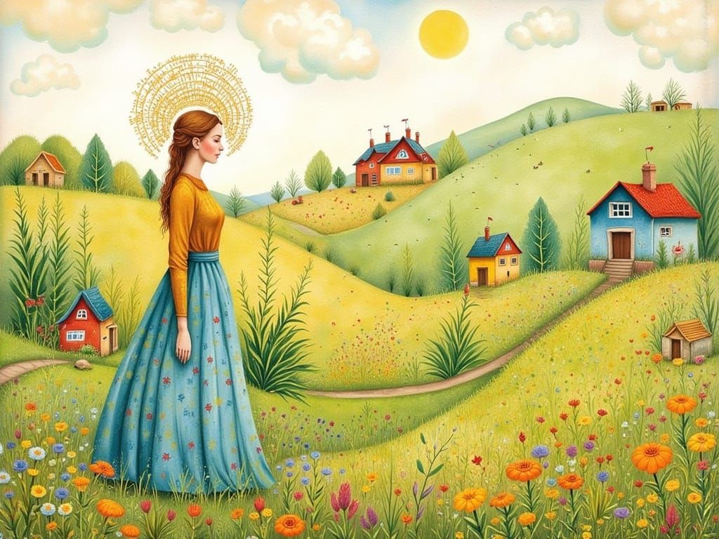 This image shows Our Lady of Herbs in a whimsical meadow. The artwork blends folk devotion with curved geometries, creating a tapestry of spirals, dots, and floral patterns as watercolor art.