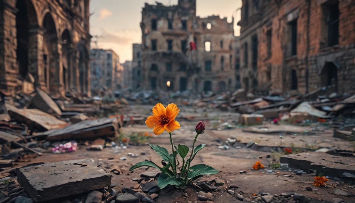 A vibrant oil painting of a lone flower blooming in a deserted, post-apocalyptic city. The warm glow and contrasting colors create a mystical atmosphere in this gritty, cinematic scene.