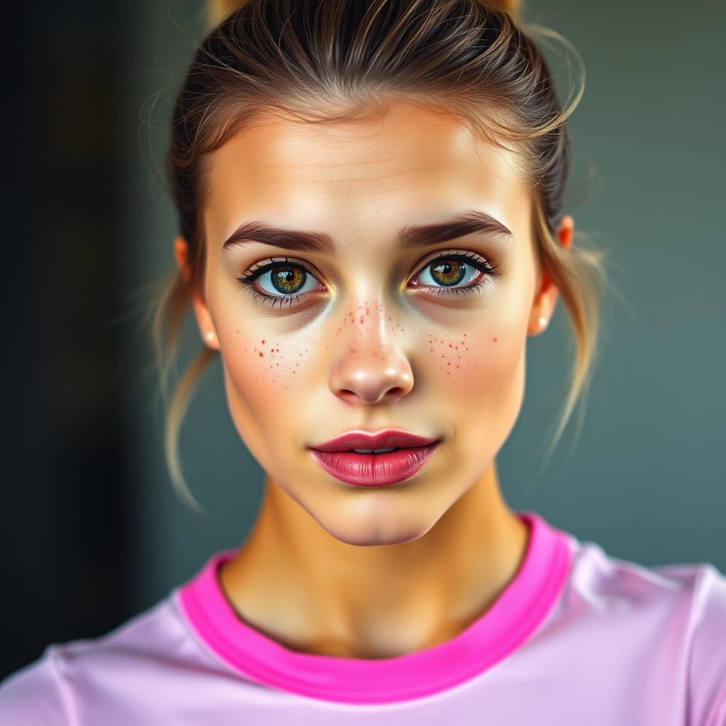 This photorealistic image captures a young woman with big brown eyes and freckles, wearing a white shirt and hot pink shorts. Shot with a 50mm lens, it features natural lighting and vibrant colors.