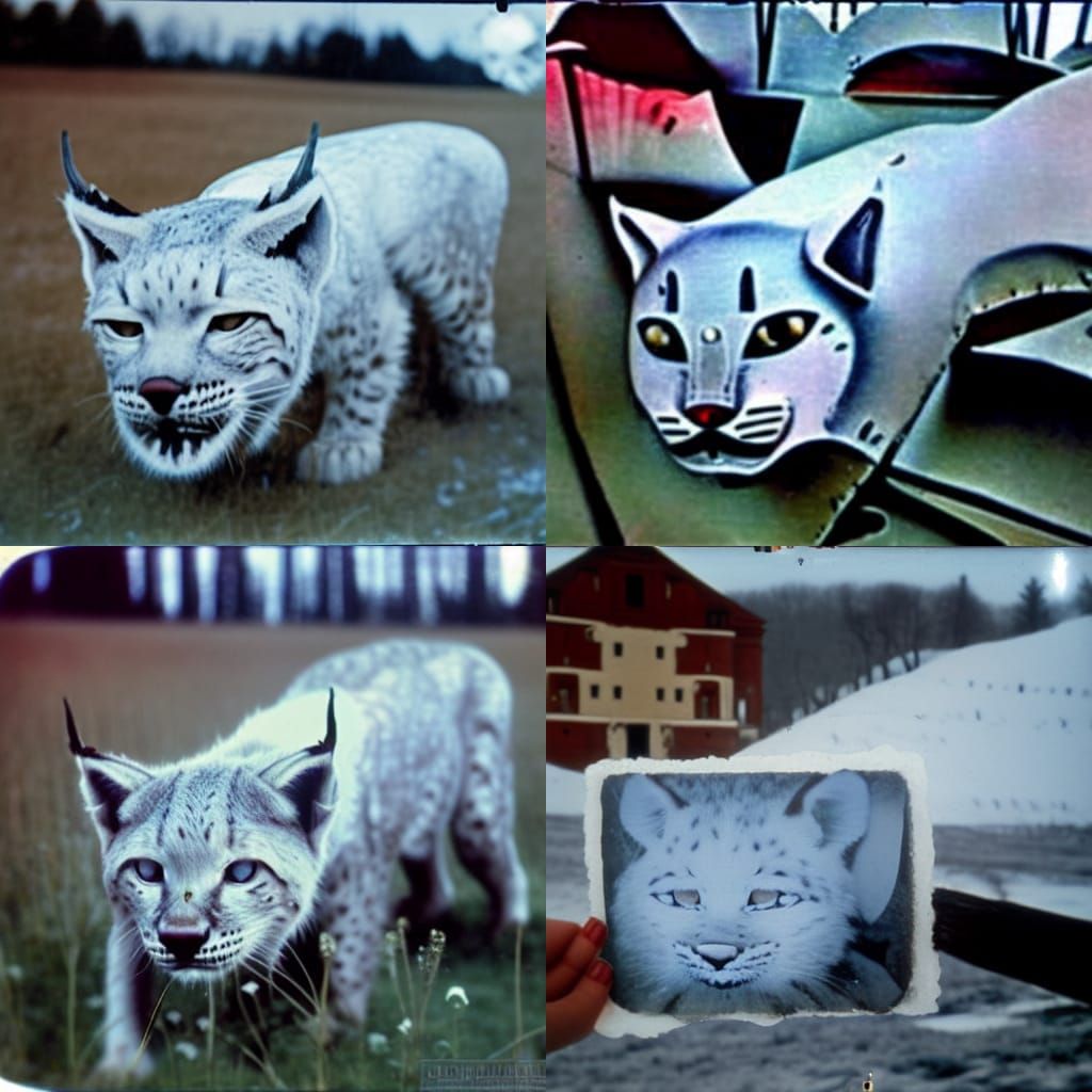 This image shows a lynx composed of ice standing in a field. The image is rendered in a vintage photographic style reminiscent of the early 20th century.
