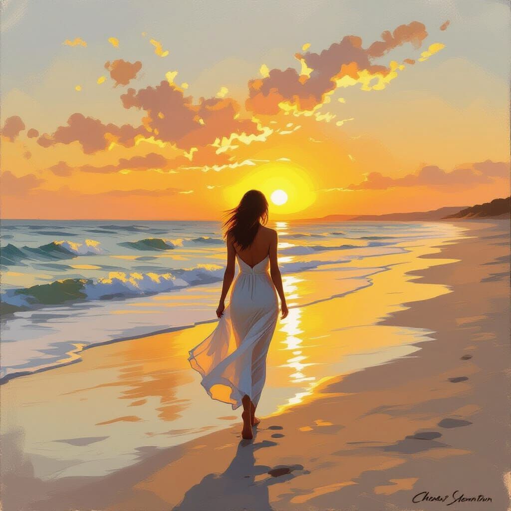 A tranquil scene of a woman strolling on a peaceful beach as the sun sets. The artwork captures the essence of a serene summer night with gentle waves, reminiscent of impressionist paintings.